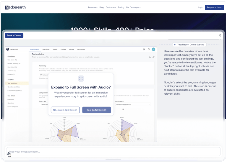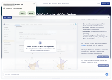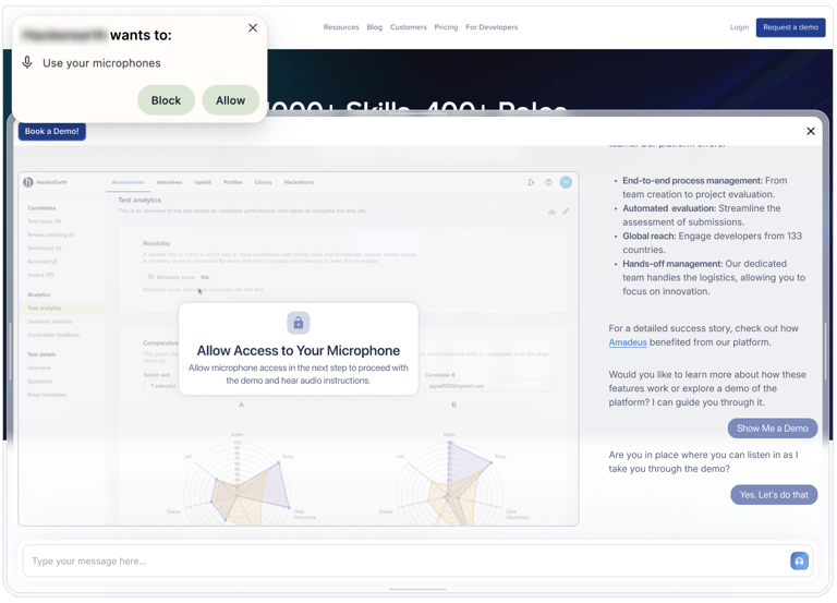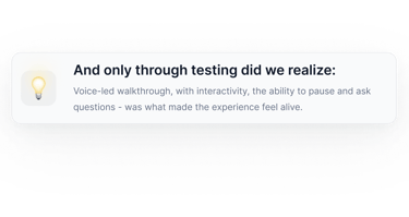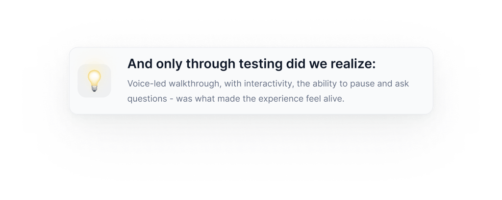 We waited until they were engaged. Then the AI would offer: “Want me to show you how it works in real time?” If they accepted, we launched Immersive Mode: a full-screen experience, voice-driven, all happening inside the browser.