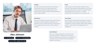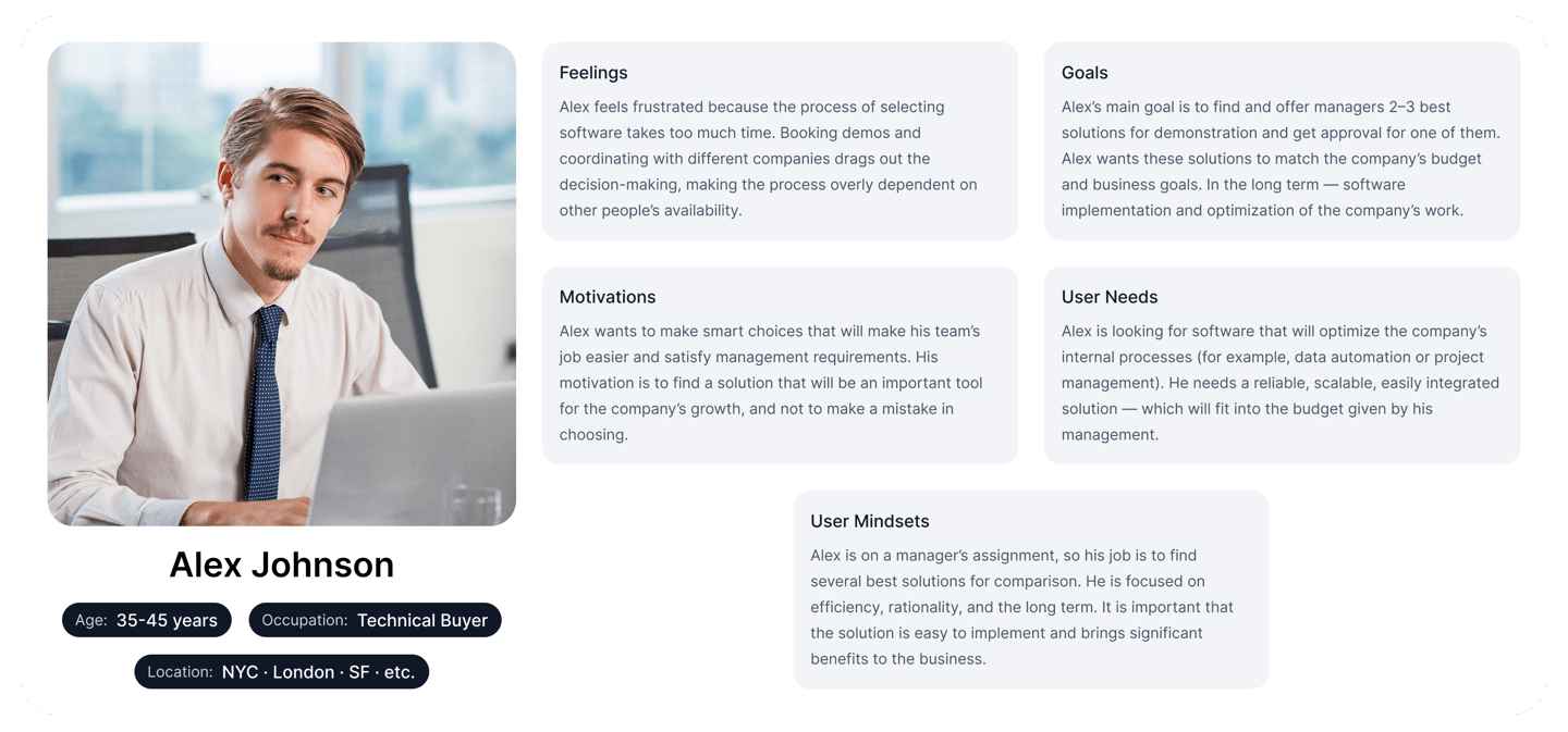Alex doesn’t make the final decision, but heavily influences it. His goal is to quickly gather a few suitable options and present a confident recommendation to the team. He dislikes pushy sales tactics and prefers to explore independently. Alex wants to say, “Here’s the answer,” not “Let me ask them again.”